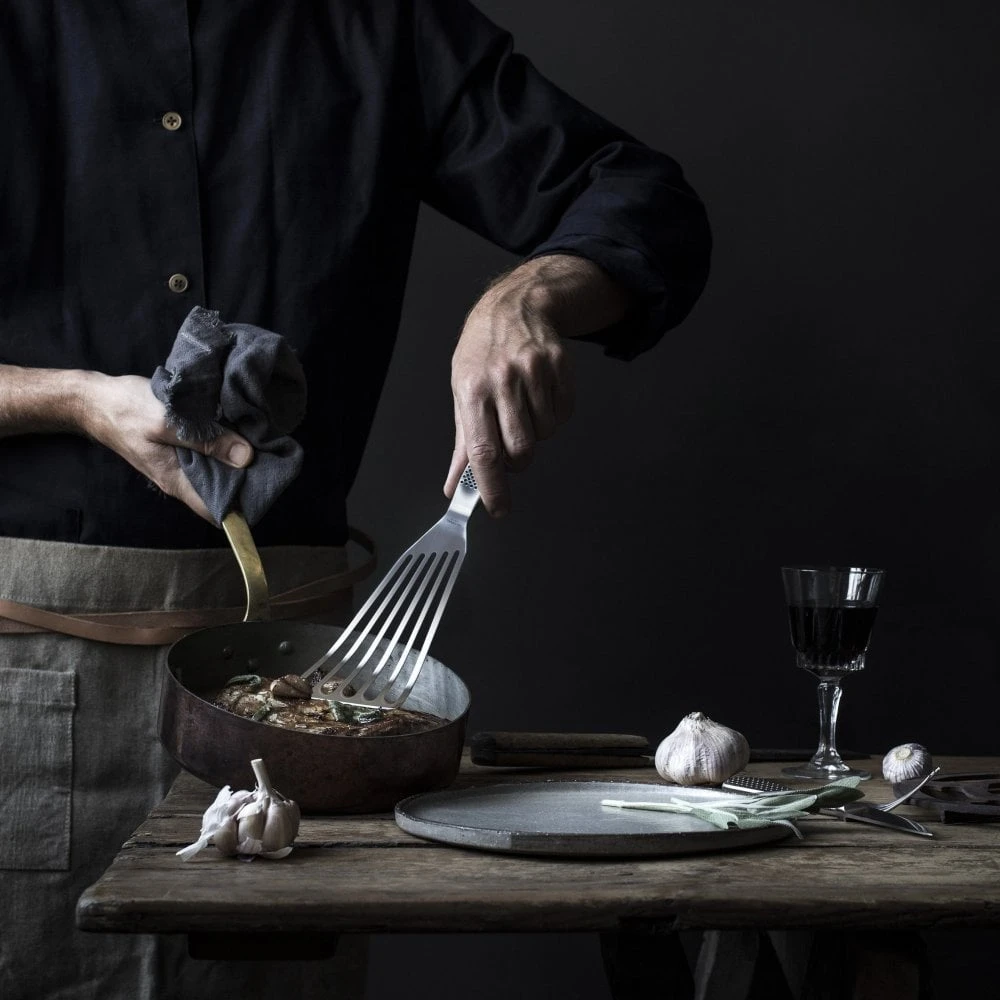 The biggest of the Global spatula range, the GS-27 Fanned Spatula Flexible has a large fanned blade with holes in, which makes this spatula particularly good for cooking with larger items that are either greasy or tend to fall apart like whole fish. The slanted edge gives a good angle to section of slices or push away grease.