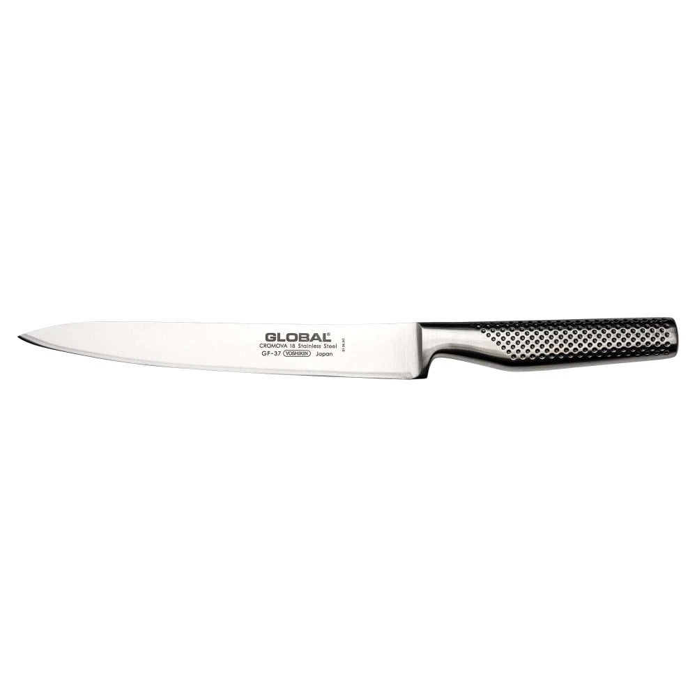 As a fully forged knife, it has a lot more strength than the standard Global carving knife and the GF-37 is fantastic for professional settings where a carving knife is needed in constant use. These make brilliant knives to use where food is brought to the table and carved in front of people, repeatedly.