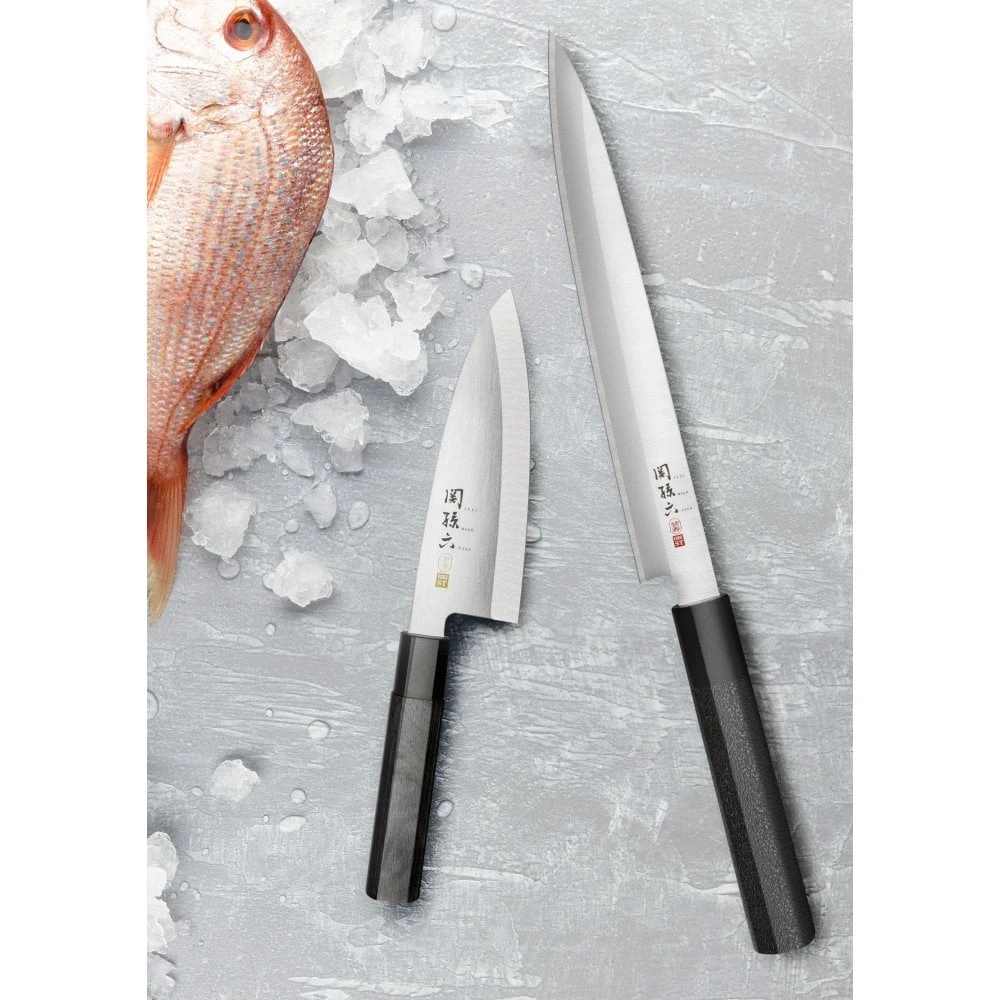 Unique technologies are applied in producing the blade of the Seki Magoroku Kinju and Hekiju knife series, making it possible to create the demanding, pointed cutting edges of traditional Japanese kitchen knives. They are ground on one side, which guarantees an optimal and straight cut. Maximum blade sharpness is achieved by the highly precise processing of the cutting edge. The handles of the Seki Magoroku Kinju and Hekiju series differ in shape and material. The hexagonal handle of Kinju knives is made of laminated, reinforced wood for a comfortable feel when cutting. The handle is extremely water-resistant, thanks to the use of high-quality natural wood which is treated by a special process. The handle of the Hekiju knife, developed for left-handers, is more rounded than that of the Kinju series and consists of a robust resin with leather-type embossing.