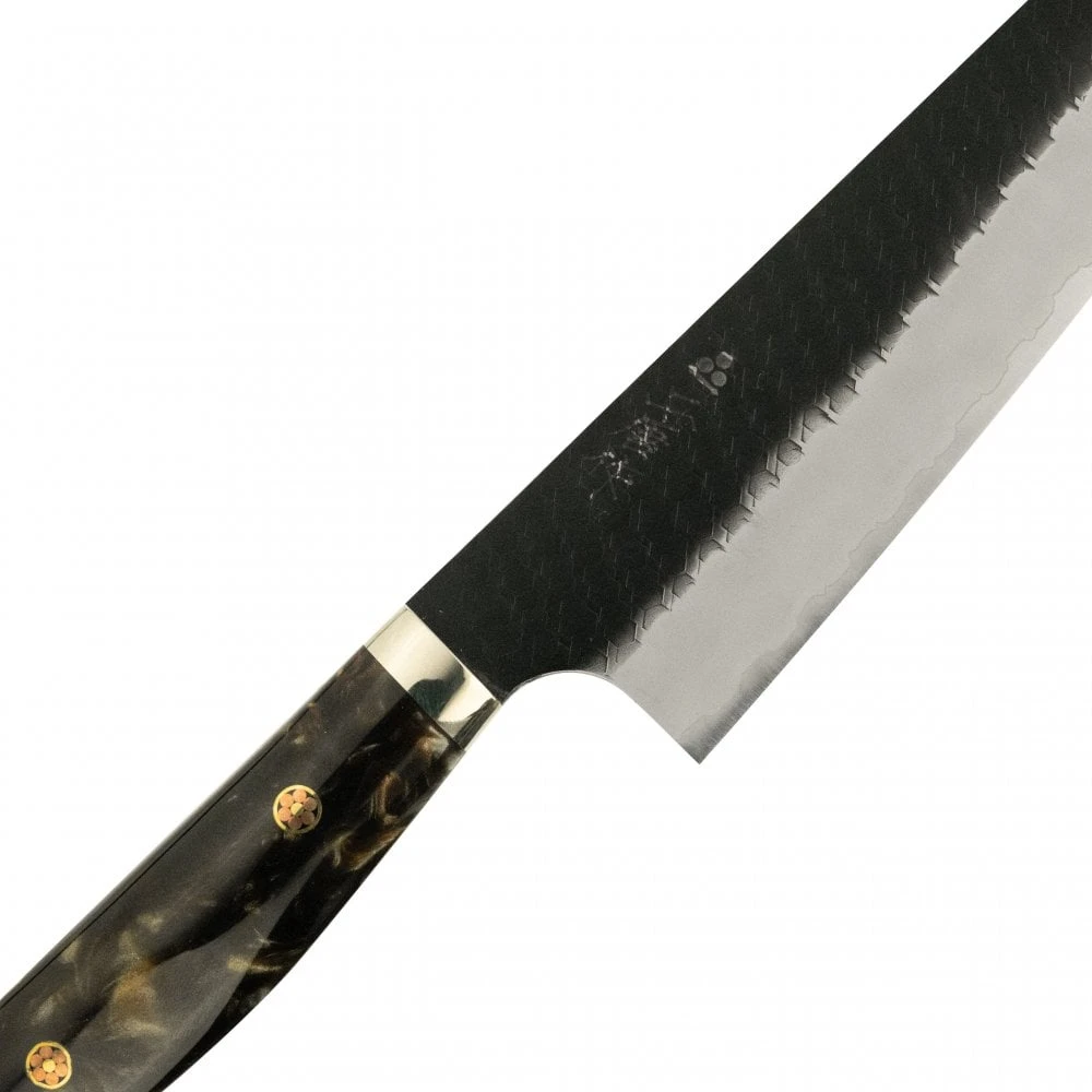 The blade is finished in a beautiful Kurouchi Tsuchime finish which is hand-hammered to create a unique pattern on every piece making them essentially a piece of artwork with an exquisite cutting edge that is subtly visible under the stainless steel cladding.